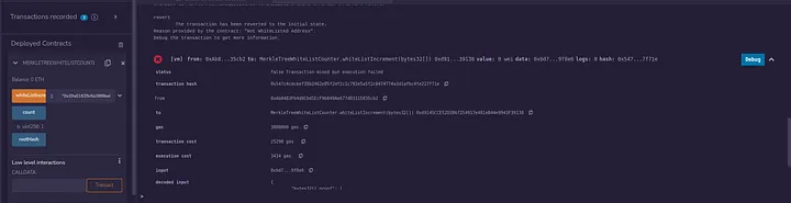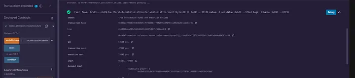 Agora, chame a função whiteListIncrement com a prova válida e use o endereço da lista de permissões para chamá-lo.
