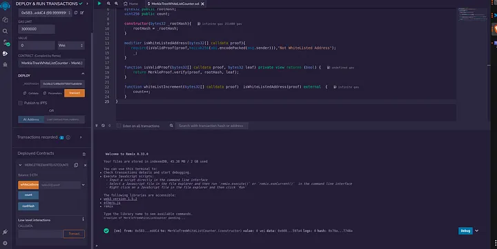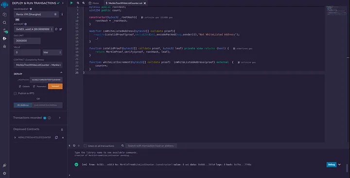 Salve e implante o contrato inteligente MerkleTreeWhiteListCounter usando RemixIDE e passe a MerkleTree RootHash para o construtor.