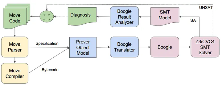 O Move Prover usa o código-fonte Move anotado como entrada e verifica se o código atende às especificações fornecidas. O processo envolve várias etapas, incluindo a extração das especificações, compilação do código-fonte, remoção de operações de staking e tradução do código para um programa na linguagem de verificação intermediária (IVL - intermediate verification language) Boogie. Esse programa é, em seguida, verificado pelo sistema de verificação Boogie e um solucionador (solver) SMT. Se o código atender às especificações, é relatado como tal para o usuário. No entanto, se o resultado não for satisfatório, o provador (prover) fornece um diagnóstico que o usuário pode usar para melhorar o código e repetir o processo. O Move Prover é escrito na linguagem de programação Rust e está disponível no repositório do GitHub da linguagem Move [5].