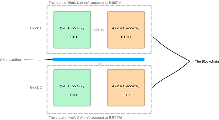 Digamos que eu tenha 3 ETH e queira enviar 1 ETH para minha amiga Anne. Assim que minha transação for concluída, o estado da minha conta será reduzido em 1 ETH e a conta de Anne mostrará 1 ETH.