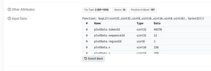 Ao observar uma determinada transação, pode não ser aparente de forma imediata qual NFT foi adquirido. Para encontrar essa informação, você precisa localizar a seção “More Details” (Mais detalhes), abri-la e buscar pela seção “Input Data” (Dados de entrada). A decodificação dos dados de entrada revelará que a transação foi executada para a função Buy L2 com um valor de id de token tokenId de 46378. Essa é a informação exata que nós estávamos buscando.
