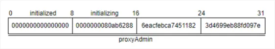 Como o próprio contrato Proxy define uma variável de estado proxyAdmin de um tipo de endereço, seu valor é 0x80ab62886eacfebca74511823d4699eb88fd097e, que também ocupa o slot de armazenamento slot0. Os primeiros 8 bytes são 0, os segundos 8 bytes são 0x80ab6288, a terceira Seção de 8 palavras é 0x6eacfebca7451182 e os quartos 8 bytes são 0x3d4699eb88fd097e. Portanto, a initialized e a initializing no contrato de implementação e o proxyAdmin no contrato Proxy ocupam o slot de armazenamento slot0 ao mesmo tempo, assim causando um conflito de armazenamento.