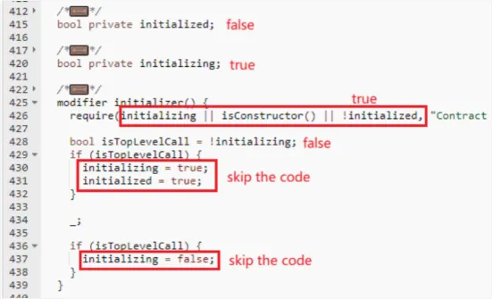 Quando a função de inicialização é executada para initializer (ou função inicializadora), a initialized é lida dos primeiros 8 bytes do slot de armazenamento slot0 e seu valor é zero, ou seja, falso; a initializing é lida dos segundos 8 bytes do slot de armazenamento slot0 e seu valor é 0x80ab6288 > 0, que é verdadeiro.