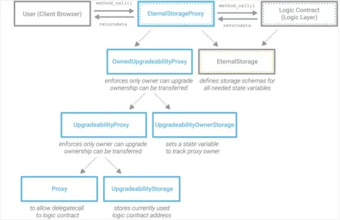(4) Se a lógica do contrato depender de seu constructor (função construtora) para definir algum estado inicial, ele deve fazer tudo de novo depois de ser vinculado ao Proxy, porque o armazenamento do Proxy não conhece esses valores. A EternalStorageProxy tem uma função upgradeToAndCall, que é especialmente usada para usar algumas funções do contrato Logic e reiniciar as configurações depois do Proxy estar atualizado para isso.