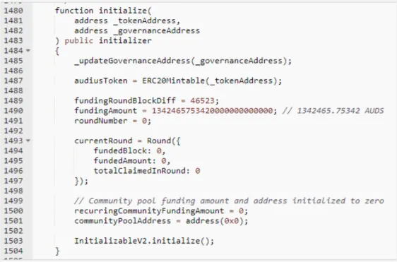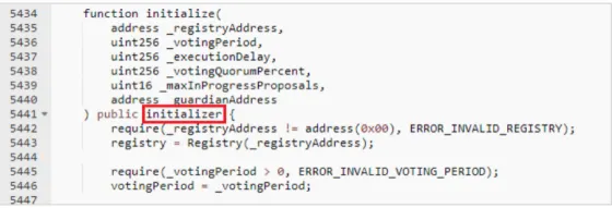 Análise do problema: a razão fundamental pela qual o invasor pode atacar com sucesso é que a função de inicialização é chamada várias vezes por meio do contrato Proxy e a função de inicialização deve ser chamada apenas uma vez. Tomemos como exemplo a função de inicialização no contrato de governança (Governance), o código é o seguinte: