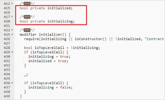 As duas variáveis de estado do tipo bool initialized (inicializada) e initializing (de inicialização) definidas no initializer (função inicializadora) no Openzeppelin ocupam os primeiros 16 bytes no slot de armazenamento slot0, respectivamente. Os primeiros 8 bytes são initialized e os segundos 8 bytes são initializing.