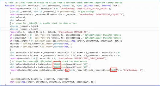 (4) Através da análise, a brecha no contrato do projeto Uranium aparece na função swap do contrato UraniumPair.sol. Essa brecha permitirá que qualquer pessoa transfira os ativos digitais do contrato à vontade e precise pagar apenas um pequeno preço. Pode-se ver que na troca (swap) há uma comparação entre a 8ª potência de 10 e a 6ª potência de 10. Este é um julgamento quase idêntico, o que significa que, enquanto a função swap for executada continuamente de acordo com uma determinada rotina, você pode limpar todos os ativos digitais neste contrato.