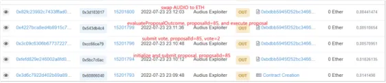 Em txHash4, a Proposta 85 foi implementada para transferir 18,56 milhões de AUDIO para o contrato de ataque. Depois que o contrato de ataque recebeu os 18 milhões de AUDIO, foi trocado por 704 ETH.
