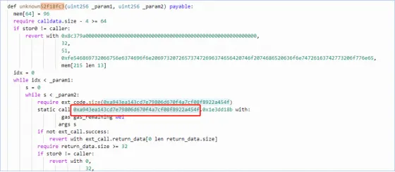 (3) Procurando o método de contrato codificado no código descompilado, você pode encontrar o endereço do contrato da parte do projeto atacada por esse contrato, que é o endereço do projeto Uranium: 0xa943ea143cd7e79806d670f4a7cf08f8922a454f