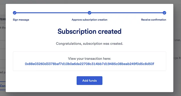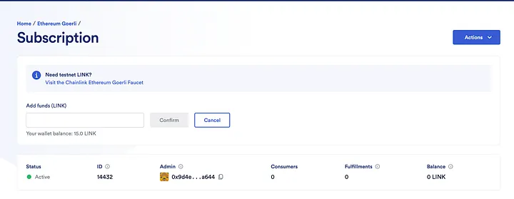 Isso significa que você configurou com sucesso sua assinatura. Nossa assinatura não tem LINK. Precisamos adicionar fundos que serão usados para interagir com a Chainlink.