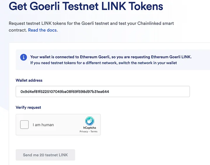 Ao clicar no texto destacado (Visite a Chainlink Ethereum Goerli Faucet), você será redirecionado para o link (https://faucets.chain.link/goerli), onde obterá 20 LINK de teste na rede de testes.