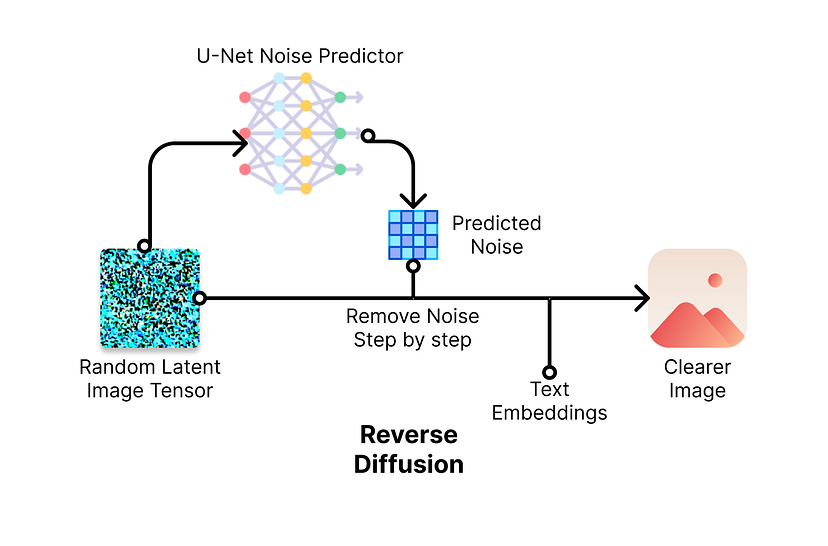No processo de difusão reversa, um detector de ruído é treinado para prever o ruído adicionado à imagem original, de modo que o modelo possa remover o ruído previsto da imagem com ruído para obter uma imagem mais nítida (no espaço latente). Você pode pensar nesse processo como olhar para uma gota de tinta parcialmente difusa na água e tentar prever o local em que ela caiu antes.