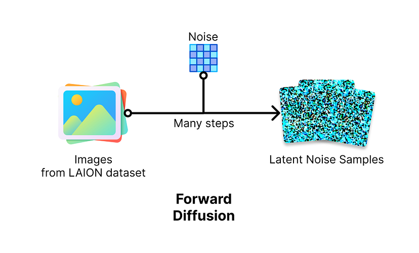 No processo de difusão direta, o modelo adiciona gradualmente ruído gaussiano à imagem para transformar uma imagem clara em uma imagem com ruídos. A cada etapa, uma pequena quantidade de ruído é adicionada à imagem, repetida em várias etapas [1] [7]. Como o nome “difusão” sugere, esse processo é como deixar cair uma gota de tinta na água – a gota de tinta se difunde gradualmente na água, até que você não consiga mais ver que antes era uma gota de tinta. Os padrões de ruído adicionados nas imagens são aleatórios, assim como as partículas de tinta se difundem aleatoriamente nas partículas de água, mas a quantidade de ruído pode ser controlada. Esse processo é feito em muitas imagens do conjunto de dados LAION com diferentes quantidades de ruído adicionadas para criar muitas amostras com ruído para treinar o modelo de difusão reversa.