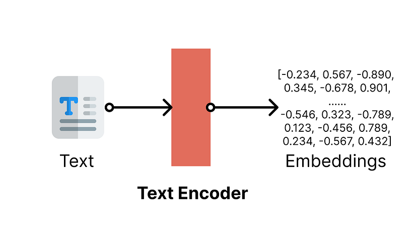 ######O codificador de texto converte o texto em embeddings vetoriais de alta dimensão. Ilustração feita com ícones do https://www.flaticon.com/
