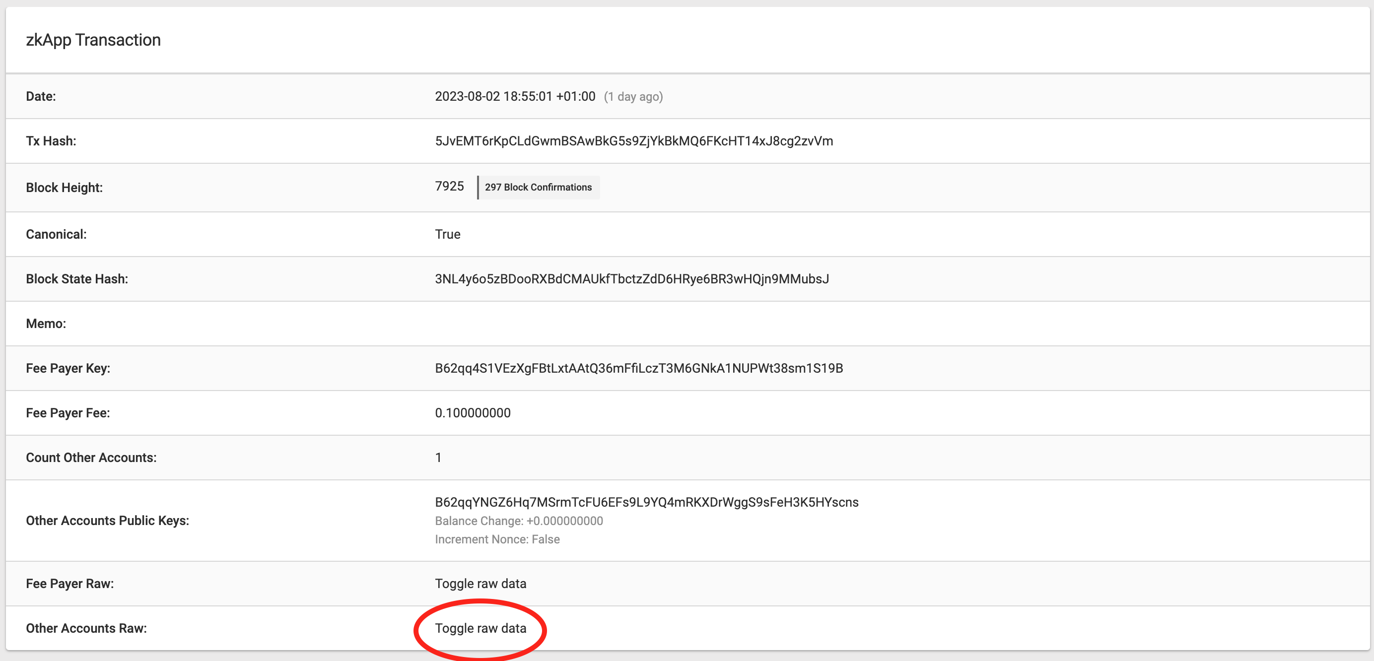 Você pode ver o estado do zkApp e as atualizações de estado quando a transação for incluída em um bloco. Primeiro, vá para o link impresso pelo script interact. Isso o levará aos detalhes da sua transação no explorador de blocos Mina Explorer. Encontre a seção Other Accounts Raw e clique em "Toggle raw data" (Alternar dados brutos).