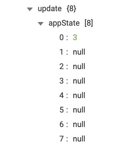 Perfeito - o primeiro elemento no array é a variável num que você inicializou como 1. Em seguida, olhe para a opção update (8). Lá você pode ver appState [8]: