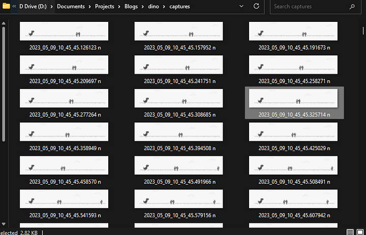 Acesse https://chromedino.com/ e comece a jogar enquanto o script captura as imagens e as salva na pasta “captures”.