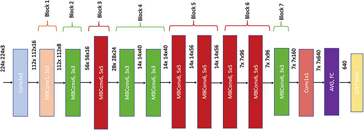 A EfficientNetV2-S é uma variante da arquitetura EfficientNet projetada para dispositivos móveis e integrados com recursos computacionais limitados. O tamanho de saída da última camada totalmente conectada no modelo é 1280, que é então alimentado em uma camada linear com dois neurônios de saída representando a tarefa de classificação binária.