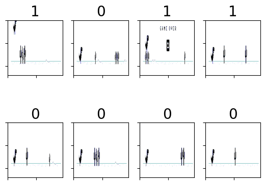 O número em cima de cada imagem mostra a tecla que foi pressionada quando a imagem foi tirada. 1 é para “espaço” e 0 é para nenhuma tecla pressionada.
