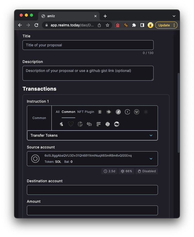 Vamos voltar ao painel e clicar em "⊕ Nova Proposal". Você será direcionado a uma página para criar uma proposta mais personalizada com uma ou mais instruções de transação. Aqui, você pode descrever uma proposta para os membros e escolher entre vários tipos de instruções de transação predefinidas. Selecione o menu suspenso para ver todas as opções disponíveis. Quando um tipo de transação é selecionado, você será solicitado a inserir as entradas necessárias para a proposta (por exemplo, destino da transferência e quantia):