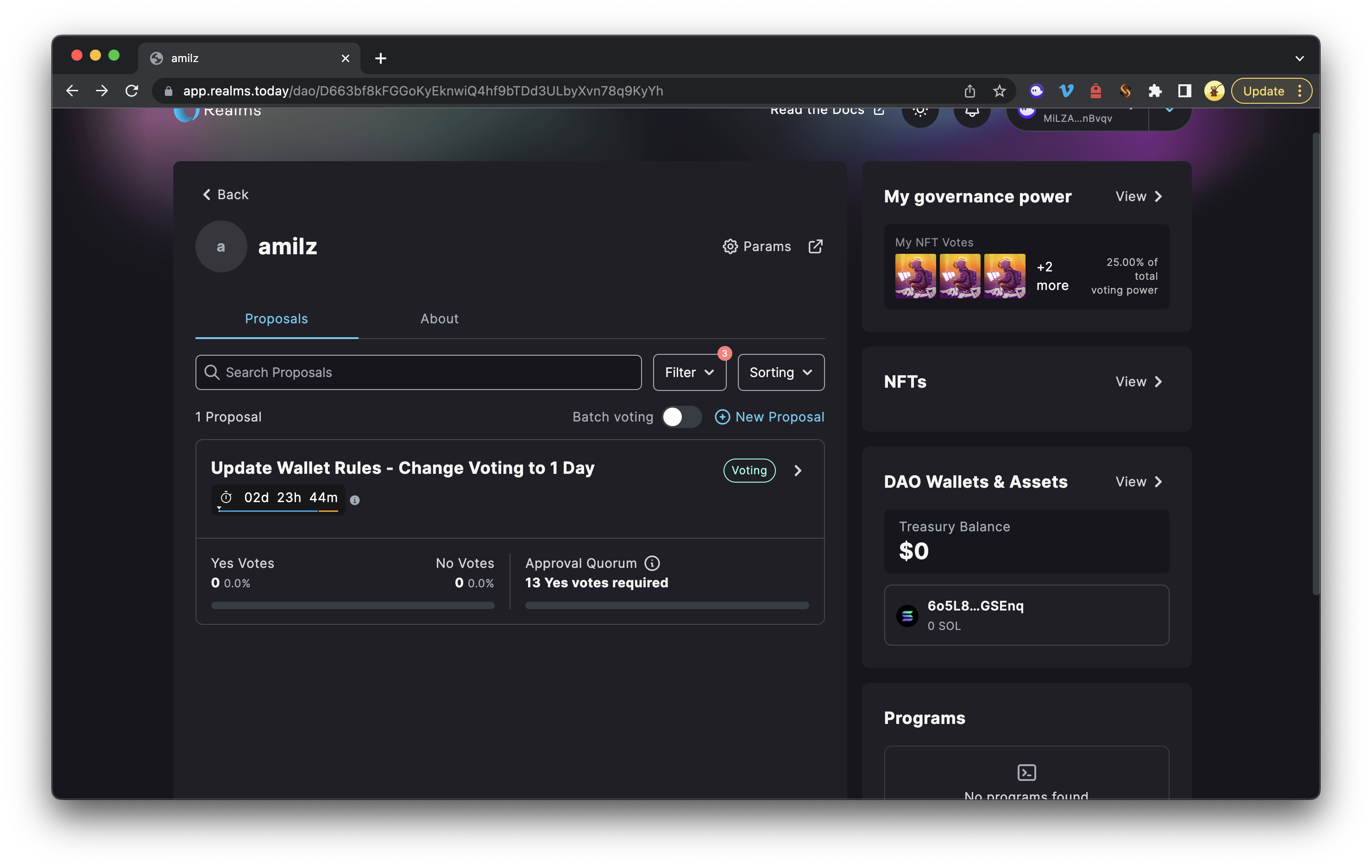 Como você pode ver aqui, você pode ver/editar as regras da DAO, adicionar tokens ao seu tesouro, criar novas carteiras (com conjuntos de regras alternativos) e ver seus ativos de relance. Há também um botão na carteira da DAO para depositar SOL. Clicar nele revelará um código QR que você pode usar com uma carteira móvel e um endereço copiável: