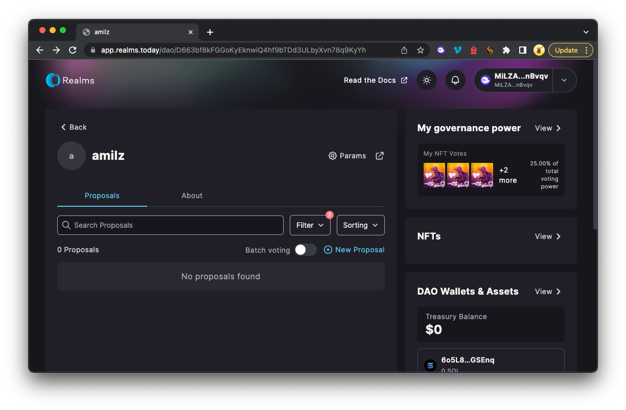 Ótimo trabalho! Você criou uma DAO. A DAO agora é acessível publicamente no endereço da barra de endereços, no entanto, apenas carteiras conectadas com NFTs qualificados podem interagir com ela. Bem legal!