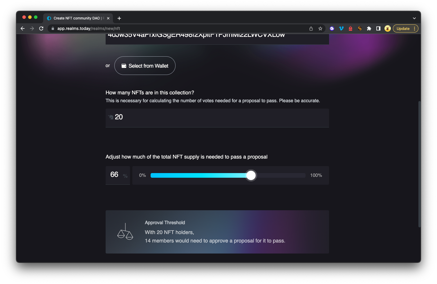 Cole isso na barra de endereços (ou selecione um NFT de sua carteira). Você precisará saber o tamanho da coleção para definir um limiar de votação para sua DAO. Para a nossa, temos 20 NFTs e definiremos o limiar de votação para 66%: