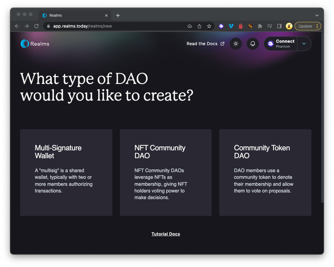 O Realms permite que os usuários criem três tipos diferentes de DAOs: