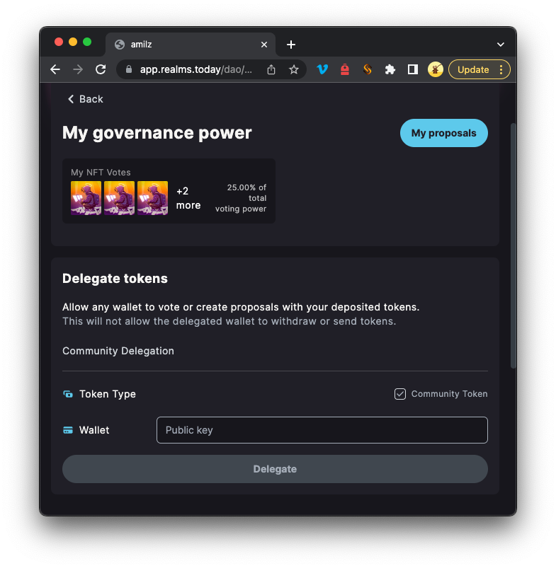 - Poder de governança: no canto superior direito, você verá seu poder de governança total (neste caso, o número de NFTs qualificados que você possui). Se você abrir isso, será levado a uma página onde poderá delegar seu poder de voto para outro endereço (isso pode ser útil, por exemplo, se seus NFTs estiverem armazenados em uma carteira fria).