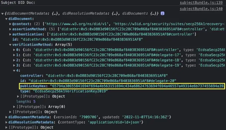 Resolvendo primeiro o Subject DID Document, podemos acessar o objeto verificationMethod que contém o publicKeyHex local onde o JWT está armazenado. Ao comparar o equivalente UTF8 do publicKeyHex com o JWT, podemos confirmar que o Subject recebeu o JWT e decidiu adicioná-lo ao seu documento DID.