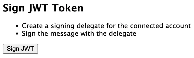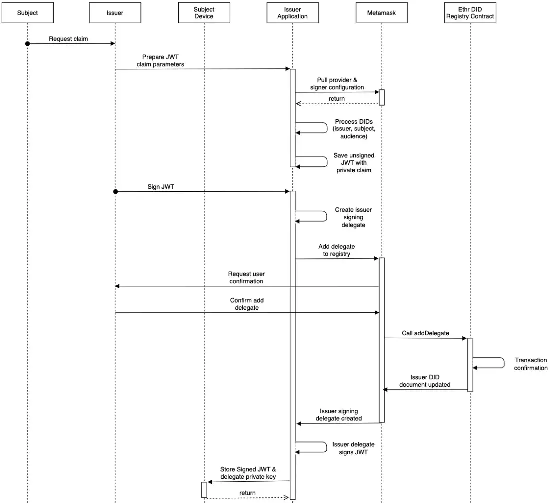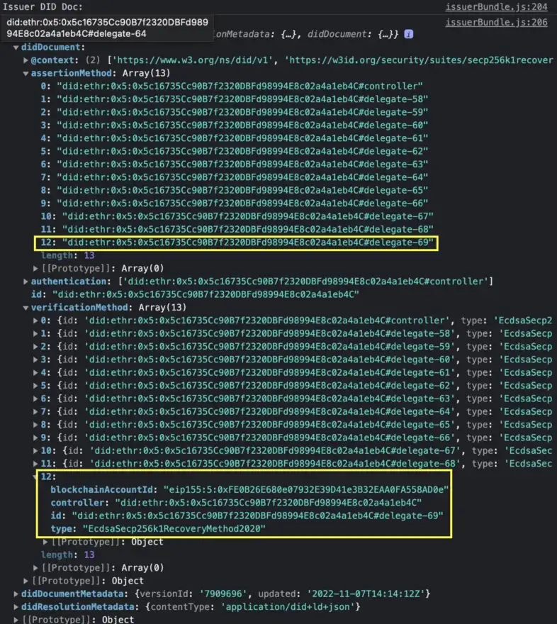 Se você abriu a guia de dados da transação, deve ter notado que estamos criando um signatário delegado com base na carteira Issuer Metamask. Isso é necessário porque “os provedores web3 não são capazes de assinar dados diretamente de uma maneira compatível com o JWT ES256K ou os algoritmos ES256K-R (não registrados)” (Começando o Ethr-Did). Ao criar um signatário delegado, um novo objeto assertionMethod e verificationMethod que vincula o emissor delegado será adicionado ao documento DID do emissor. Isso é o que permite que o JWT seja verificado posteriormente.