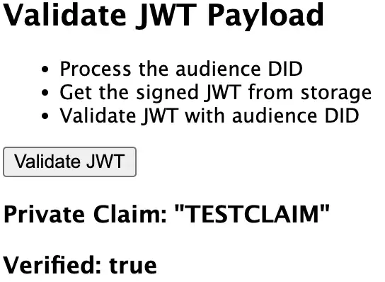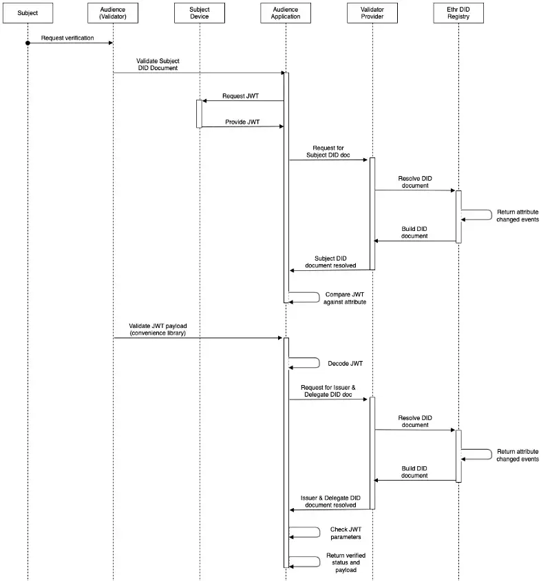 Embora o JWT possa ser facilmente verificado chamando verifyJWT() da biblioteca ethr-did, este guia também implementa um fluxo de validação usando o fluxo alternativo acima. Além das diferenças em termos de qual documento DID está sendo extraído, a validação em relação ao documento DID em questão também visa fornecer uma visão altamente simplificada de como o JWT é verificado: