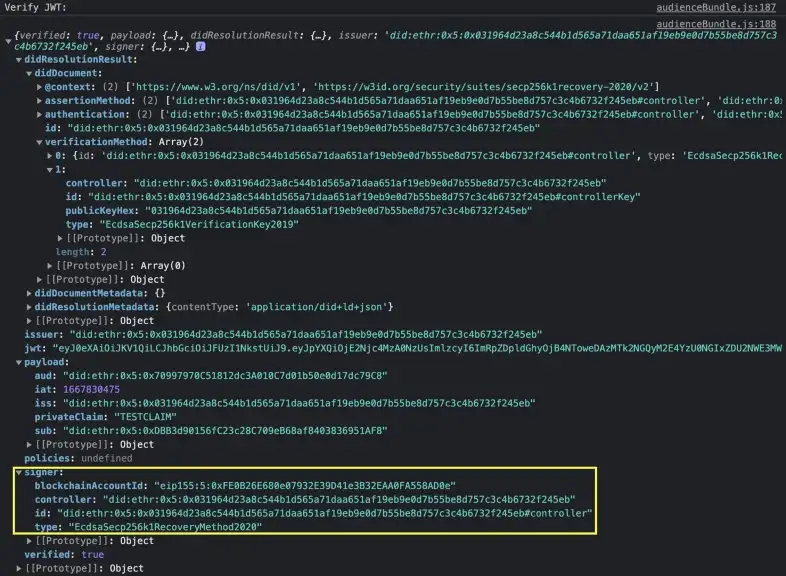 Embora o valor verified seja tudo o que é necessário para validar o JWT, a biblioteca ethr-did também retorna detalhes adicionais sobre o JWT e o signatário para sua conveniência.