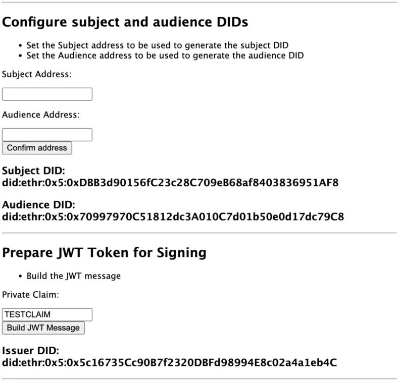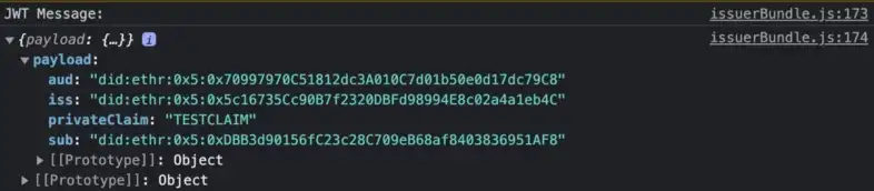 Você pode substituir facilmente os padrões desses 3 campos por meio da interface do usuário ou alterando as variáveis relevantes no código (subjectAddress, audienceAddress, privateClaim). Em particular, precisaremos acessar as chaves privadas do sujeito para assinar transações on-chain na seção opcional a seguir. Ao construir a mensagem JWT, você deve ver o objeto impresso no console do navegador: