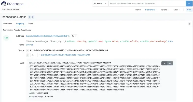 Você também pode visualizar a transação confirmada e o evento resultante DIDAttributeChanged via Etherscan:
