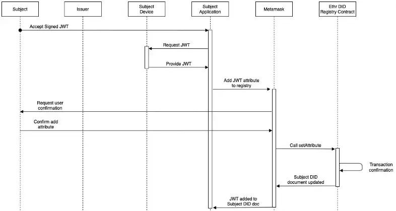 - Adição de JWT ao Documento DID do Sujeito pelo Sujeito [OPCIONAL: Somente para reivindicações persistentes on-chain, para considerar os requisitos de privacidade].
