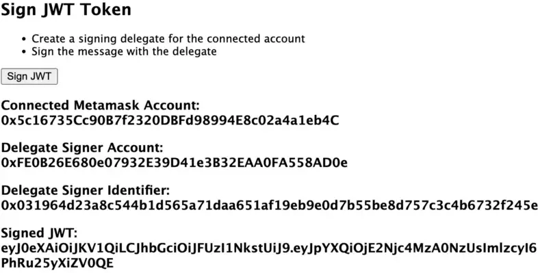Observe que a biblioteca ethr-did também substituirá o iss em nossa payload (carga útil) pelo DID do signatário delegado (guia atualizado de assinatura com o DID do emissor aqui). Uma vez confirmado pela rede de testes Goerli, você deve ver o endereço do delegado, bem como o JWT sendo exibido na interface do usuário: