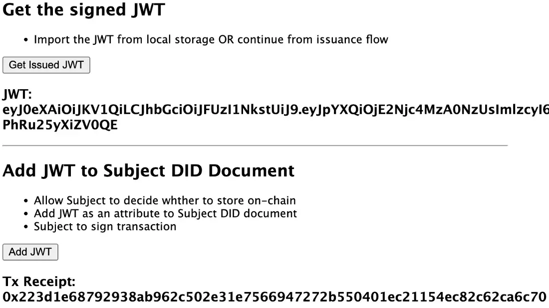 Com a conta Subject conectada e financiada com algum ETH de teste, podemos então adicionar o JWT ao Documento Subject DID selecionando o botão "Add JWT" que solicitará que você assine a transação na Metamask. Um recibo de transação é retornado assim que o JWT é adicionado: