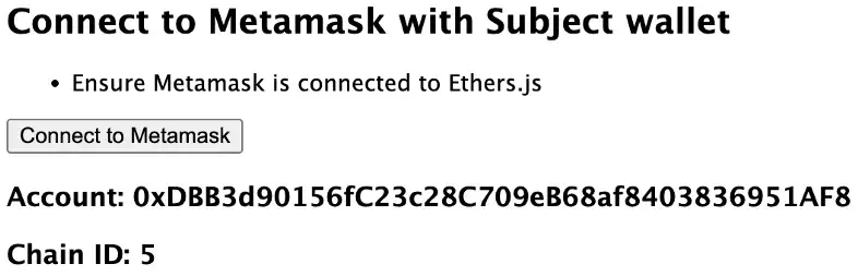 Navegue até o Subject App e altere a conta Metamask conectada para a do Subject. Você pode verificar a conta conectada clicando no botão a seguir: