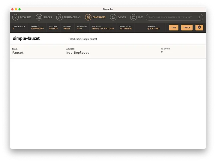 Após o reinício, as informações sobre nosso contrato devem aparecer na guia 'Contracts'. Como você pode ver, ele ainda não foi implantado: