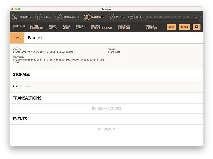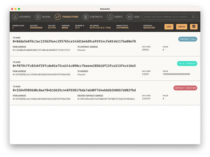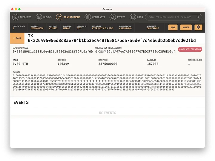 Podemos ir até a aba 'Transactions' (Transações) e olhar a própria transação que criou o contrato: