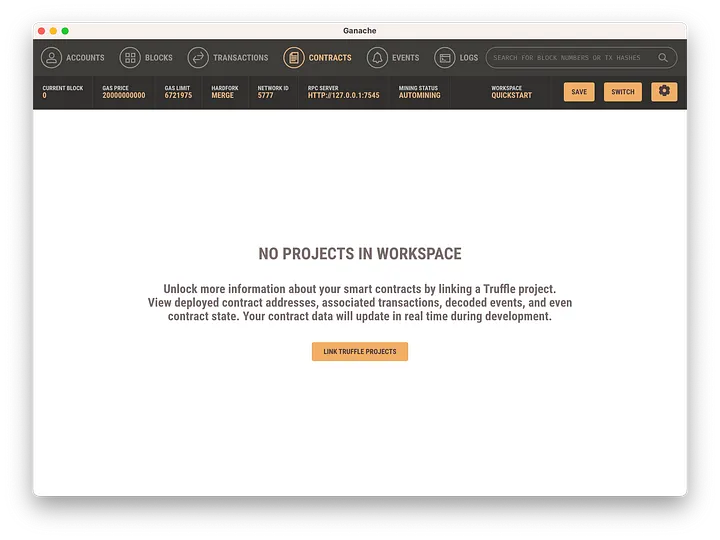 Para que o Ganache consiga visualizar o contrato inteligente, precisamos apontá-lo para o arquivo de configuração do nosso projeto. Nome do arquivo de configuração: truffle-config.js. Para fazer isso, vá para a aba 'Contracts' (Contratos), e clique em LINK TRUFFLE PROJECTS (Vincular os Projetos do Truffle):