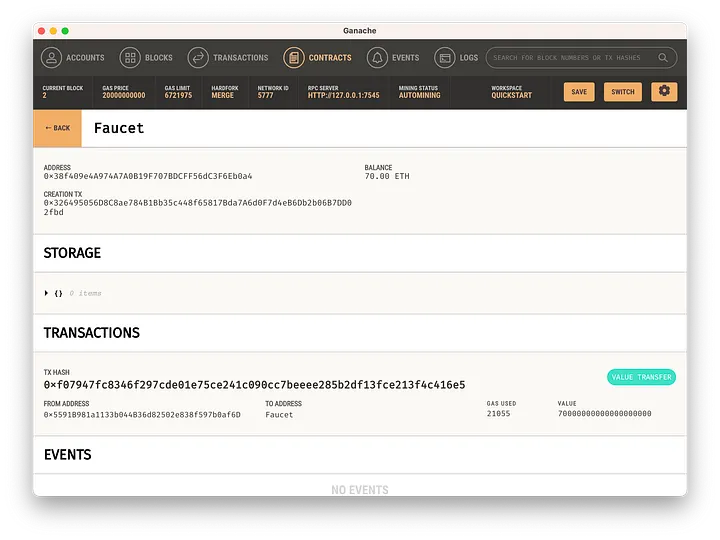 No Ganache, também vemos que 70 Ether foram cobrados do remetente: