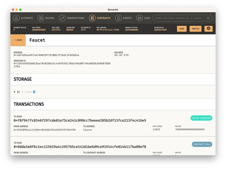Voltemos ao Ganache e vejamos o status do nosso contrato: