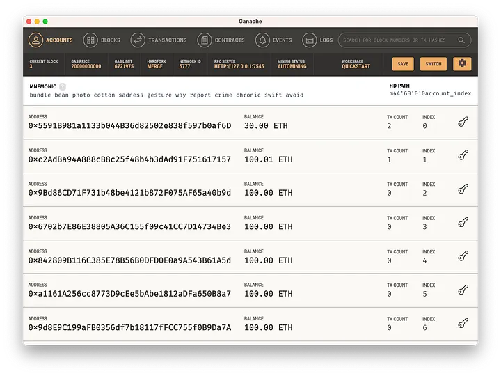 Isso pressupõe que você já tenha o Ganache e o Truffle instalados. Caso contrário, você pode verificar a instalação em meu artigo anterior. Se conceitos como EOA (Conta de Propriedade Externa), conta de contrato, transação, gás não são familiares para você, consulte meus artigos anteriores, cujo link deixarei no final do guia.