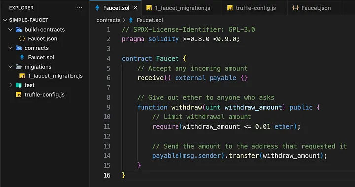 Trataremos da finalidade desses diretórios ao longo do caminho, mas por enquanto, na pasta de contratos, criaremos nosso contrato e o chamaremos de Faucet.sol: