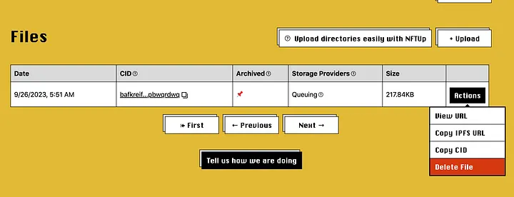 Depois de adicionar uma imagem, copie o URL do IPFS no menu Actions. Você precisará dela.
