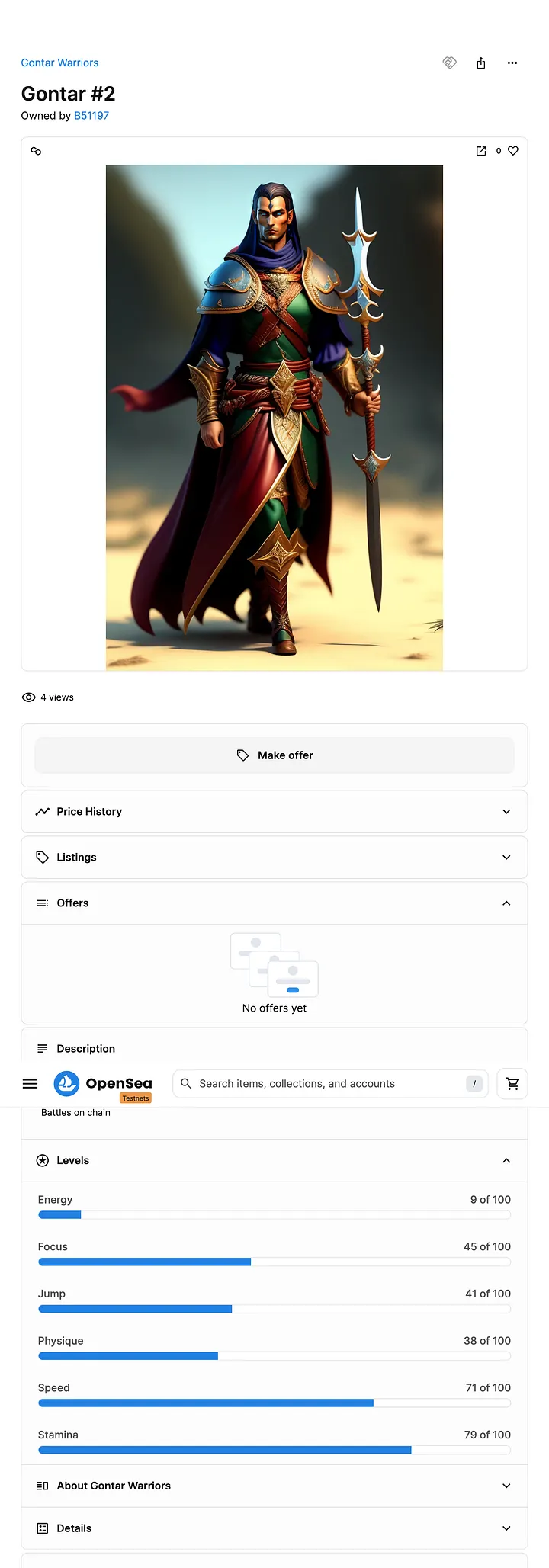 Aqui está o meu NFT. Se você olhar com cuidado... eu tenho um NFT criado com seis (6) atributos (Energia, Foco, Salto, Físico, Velocidade e Resistência). Se criarmos outro NFT, observaremos a diferença nos valores dos atributos.