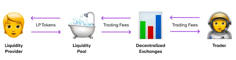 Os AMMs dependem de pools de liquidez, que são reservas de tokens que os usuários contribuem para permitir a negociação. Os provedores de liquidez depositam valores iguais de dois tokens diferentes no pool para estabelecer um par de negociação. Por exemplo, um pool de liquidez pode consistir em tokens ETH e DAI. Esses provedores de liquidez ganham taxas por sua contribuição para a liquidez do pool e são recompensados com base em sua participação proporcional no pool total.