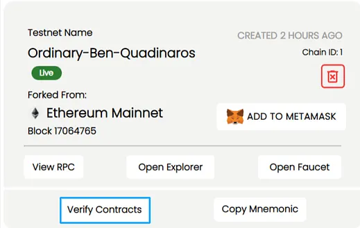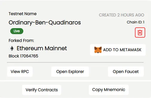 3.3. Adicione sua rede de testes privada na sua carteira MetaMask usando o botão “Add to Metamask”: